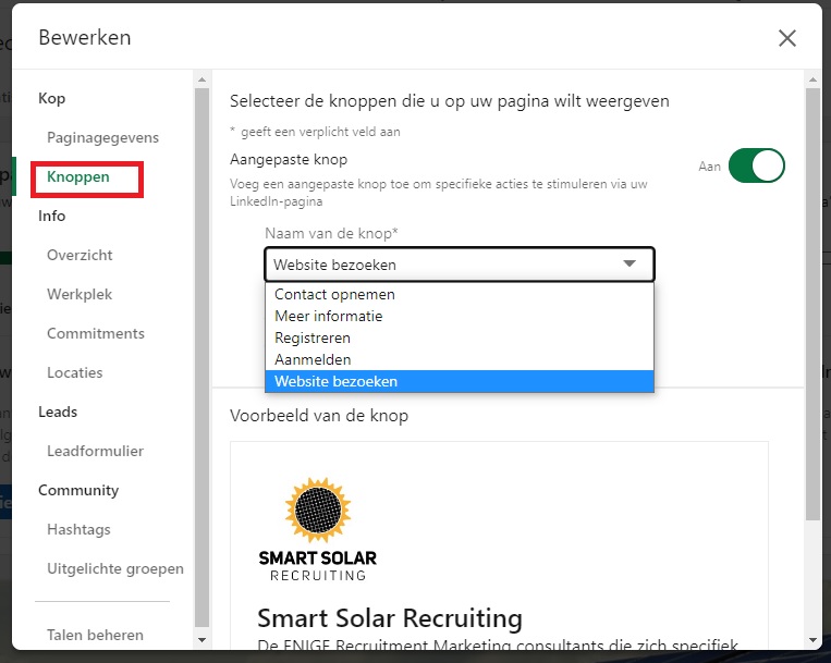 LinkedIn geeft je de mogelijkheid een aantal buttons toe te voegen, variërend van ‘Contact opnemen’ of ‘Bezoek Website’.