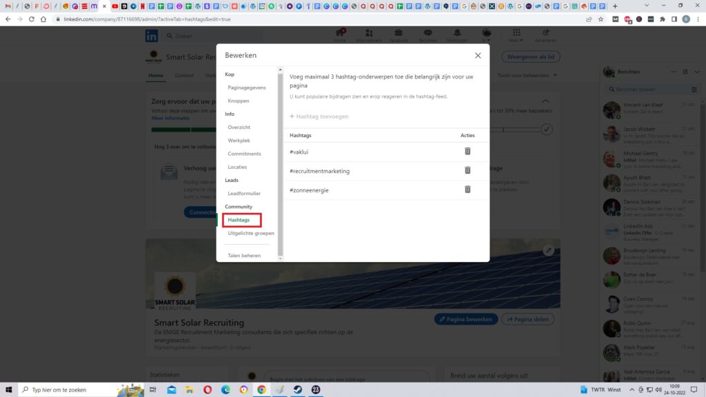 Op onze LinkedIn pagina gebruiken we bijvoorbeeld nu de Hashtags: #Recruitmentmarketing, #zonnepanelen #vaklui