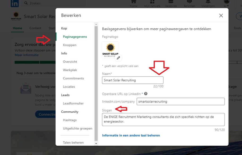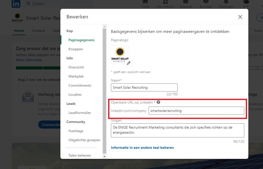 Bij Bedrijfsnaam (Company Naam) zet je uiteraard je bedrijfsnaam. Het kan zijn dat een soortgelijke organisatie je exacte naam op LinkedIn al in heeft gepikt. Probeer dan een naam te gebruiken die zo dicht bij jouw originele bedrijfsnaam komt.